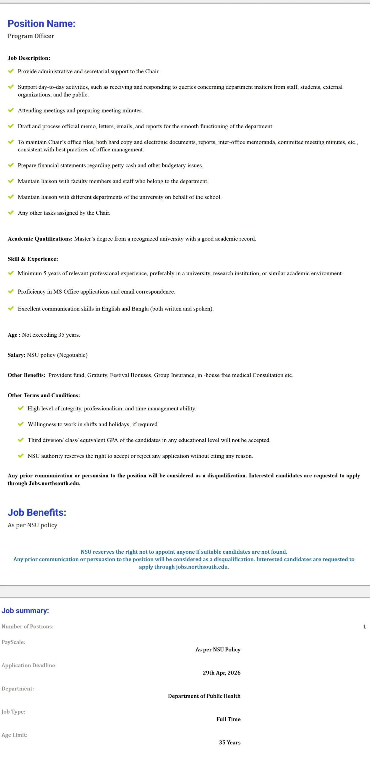 North South University has a job opening for a Program Officer in the Public Health Department. They posted this job on March 31 2026. They are taking applications until April 29 2026. This is a full-time job. There is only one spot available. You have to be 35 years old or younger to apply.