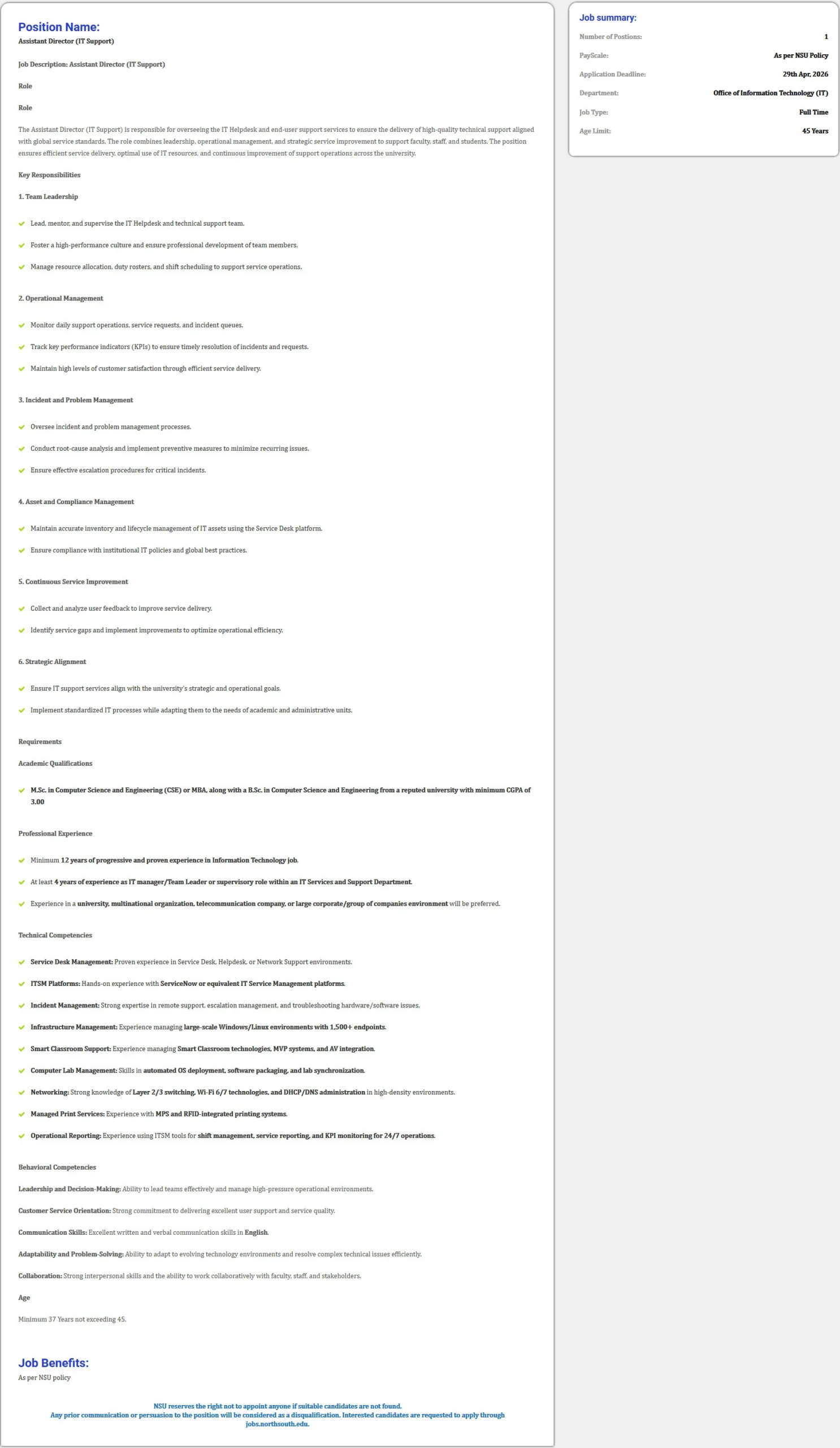 Assistant Director IT Support Job at North South University 2026. North South University is looking for an Assistant Director for IT Support. This job was posted on March 17 2026. They are taking applications until April 29 2026. The Assistant Director for IT Support will work time and they are looking for someone who is between 37 and 45 years old.