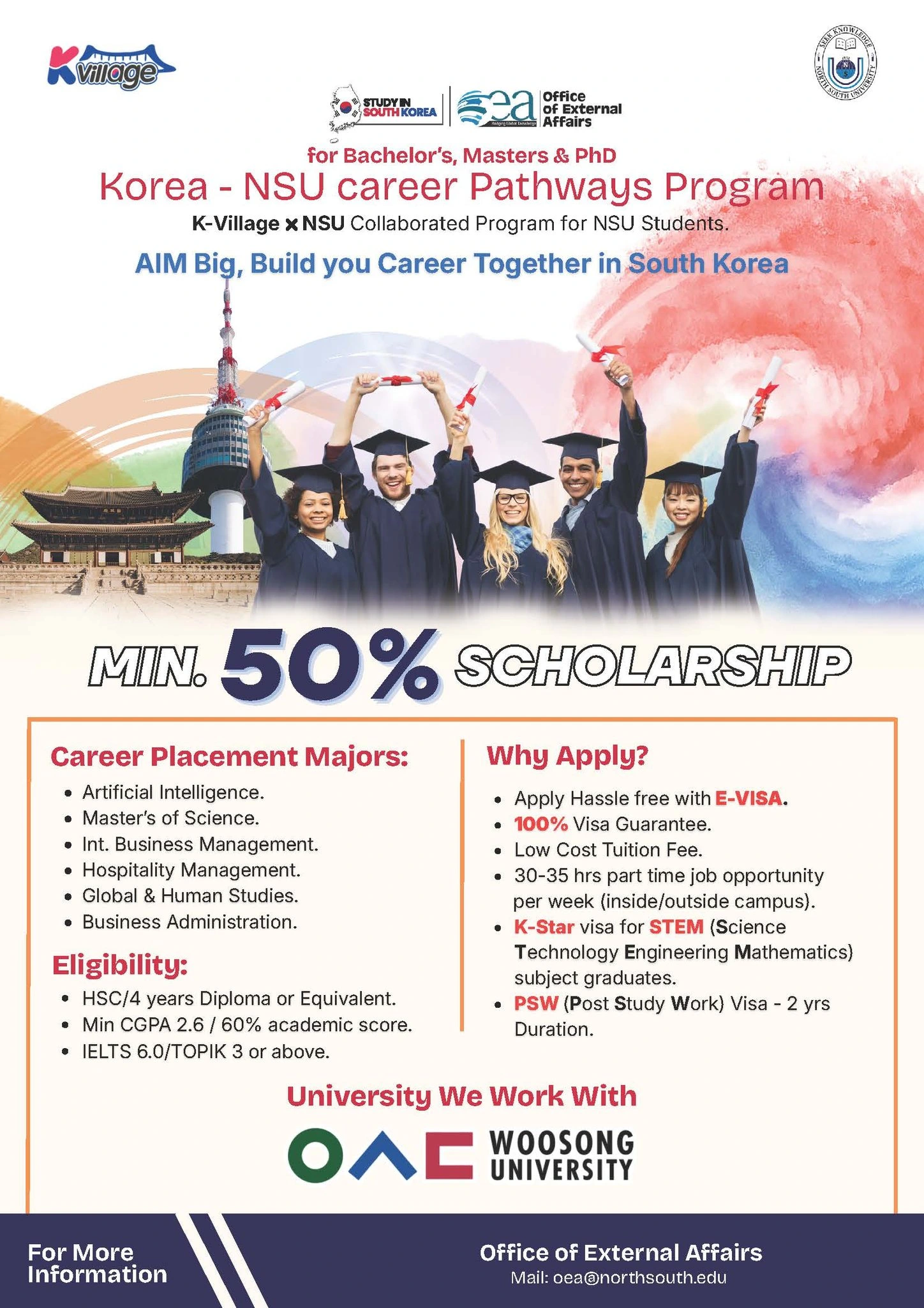NSU Career Pathways: Global Opportunities in South Korea with Woosong University. North South University’s Office of External Affairs has partnered with K-Village to launch an exclusive Career Pathways Program, offering students a seamless transition to higher education and professional life in South Korea. This collaborative initiative provides a direct route for Bachelor’s, Master’s, and PhD candidates to study at prestigious institutions like Woosong University, backed by significant financial incentives and long-term residency prospects.