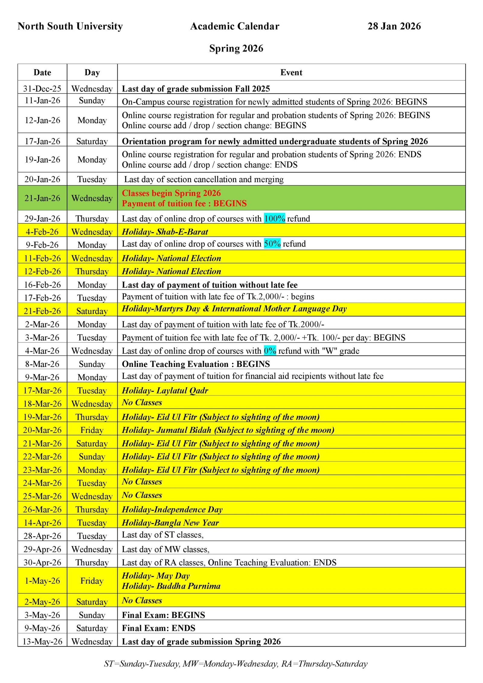 NSU Academic Calendar Spring 2026, Updated on 28 Jan 2026. North South University (NSU) has officially released the Academic Calendar for Spring 2026, outlining all major academic activities, registration deadlines, holidays, examinations, and important payment schedules. Students are strongly advised to review the calendar carefully to avoid missing critical deadlines during the semester. The Spring 2026 semester at NSU will begin on Wednesday, January 21, 2026, with regular classes starting on that day. Tuition fee payment for the semester will also begin from the same date.