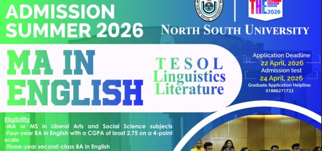 NSU Admission Notice for MA in English Summer 2026. North South University has announced that online applications are now open for the MA in English program for Summer 2026. North South University (NSU) has officially announced the opening of online applications for its Master of Arts in English program for the Summer 2026 semester. As the demand for high-level English proficiency and critical analytical skills grows in the global corporate and academic sectors, NSU’s Department of English and Modern Languages (DEML) continues to position itself as a premier destination for advanced linguistic and literary studies.